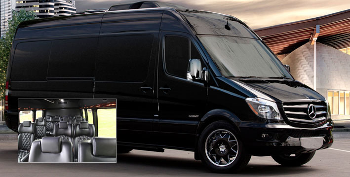 10 passengers with luggage, 14 passengers without. The Mercedes Sprinter features forward-facing leather seats and will take your group to their destination in executive style and comfort.