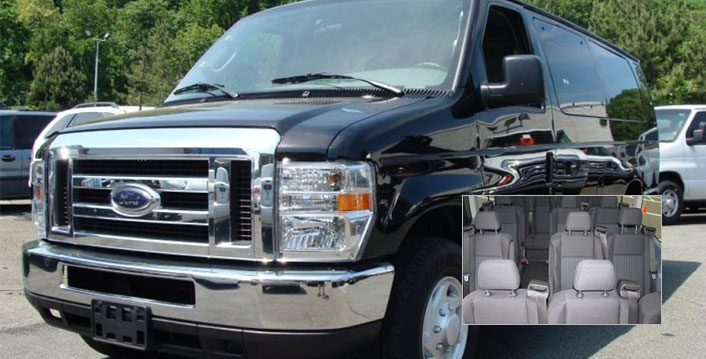 Larger group, smaller budget. The economy van category includes Ford Econoline and other similar vans. With forward-facing bench seats, this van is perfect for those looking to get somewhere without breaking the bank. Fits 10 passengers with luggage, 13 without.